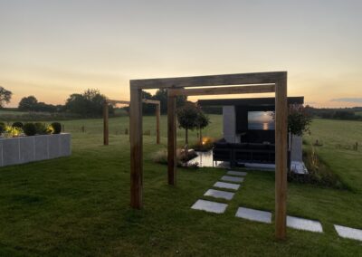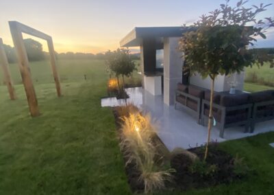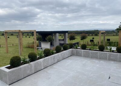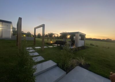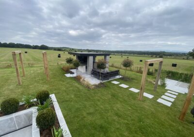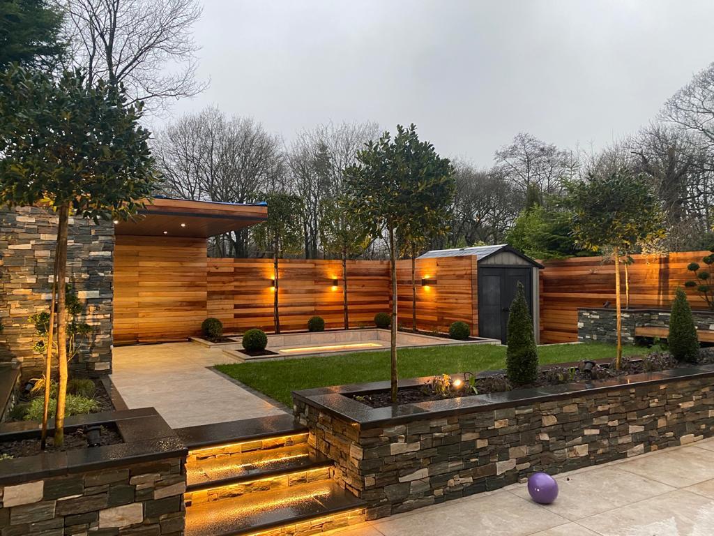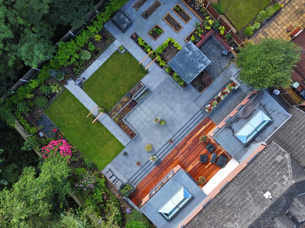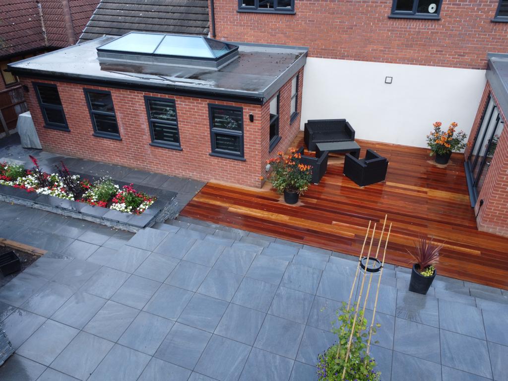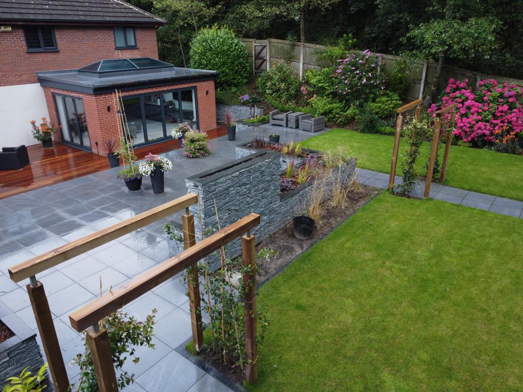 This beautiful landscape garden in Wigan is the perfect example of a high end finished landscaping project. The house had two externsions built onto the back of it before we started designing the garden. With wood decking bettwen the extensions leading onto a high finish paved area. The Client also wants some raised flower beds and a Garden room they would sit in. This is one of our favourite gardens we have done todate.